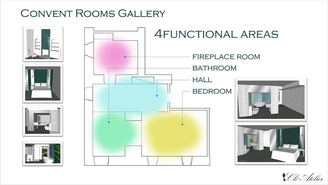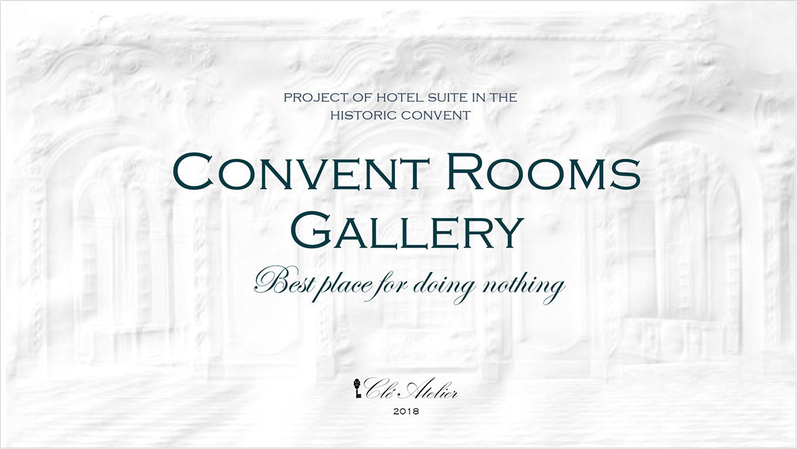 Проект разработан для участия в конкурсе дизайна интерьеров отеля Convento Room Gallery, который в будущем разместится в историческом здании монастыря, построенного в 1667 году в тихом местечке Chamusca, в Португалии. Бывший монастырь располагает большой коллекцией живописи, которая и дала название будущему отелю - Room Gallery.